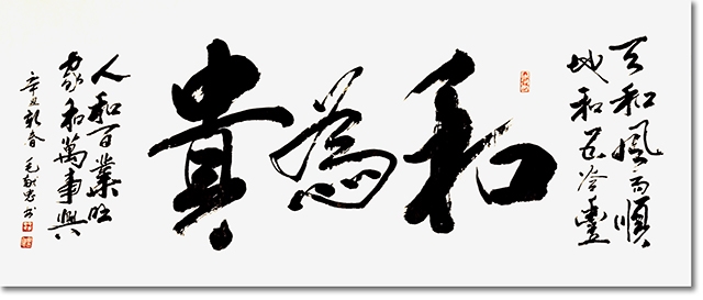 多年来,毛献忠先生的作品频繁亮相国内外重要展场,从法国卢浮宫到美国纽约艺术中心,从韩国首尔书艺双年展到日本东京国际书画展,再到阿联酋迪拜、马来西亚吉隆坡的文化交流活动,他以书法为桥,让中国笔墨语言走向世界舞台。其作品被APEC中华艺术博物馆、山东青岛博物馆、台湾佛光山寺等专业机构收藏,更被香港、马来西亚、阿联酋的知名学者与藏家珍视,成为连接中外文化的纽带。他与欧阳中石、沈鹏、苏士澍等艺术界泰斗的深度合作,近二十部个人与合作出版的专著,不仅见证了他的艺术高度,更彰显了他在当代书画传承与发展中的重要地位。