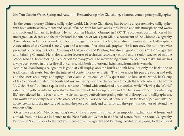 从三尺讲台到国际艺坛,从笔墨耕耘到文化传播,毛献忠先生以半个世纪的艺术坚守,诠释了当代书家的责任与追求。他的书法,是传统与当代的对话,是东方与西方的交流,更是个人情怀与时代精神的共鸣。在未来的岁月里,相信他将继续以笔墨为舟,载着中国文化的深厚底蕴,驶向更广阔的世界,为当代书坛留下更多温润而有力的印记。