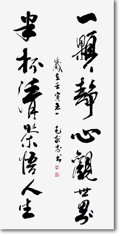 毛献忠先生的书法,以行草为擅,笔墨间既有传统碑帖的筋骨,又有当代审美的意趣。其笔下线条刚柔相济,结体奇正相生,如这幅“一颗静心观世界,半杯清茶悟人生”的对联,笔墨酣畅淋漓,气韵贯通全篇。“一颗静心”四字以凝练笔触勾勒出静定澄澈的心境,“观世界”则以开阔笔势延展格局;下联“半杯清茶”的温润与“悟人生”的通透相映成趣,在黑白虚实间,将东方哲思与书法艺术完美融合。他的作品不仅是视觉的审美对象,更是精神的栖息之所,观者在笔墨流转间,可品出茶的清润、心的安宁,亦可读出人生的豁达与生命的智慧。